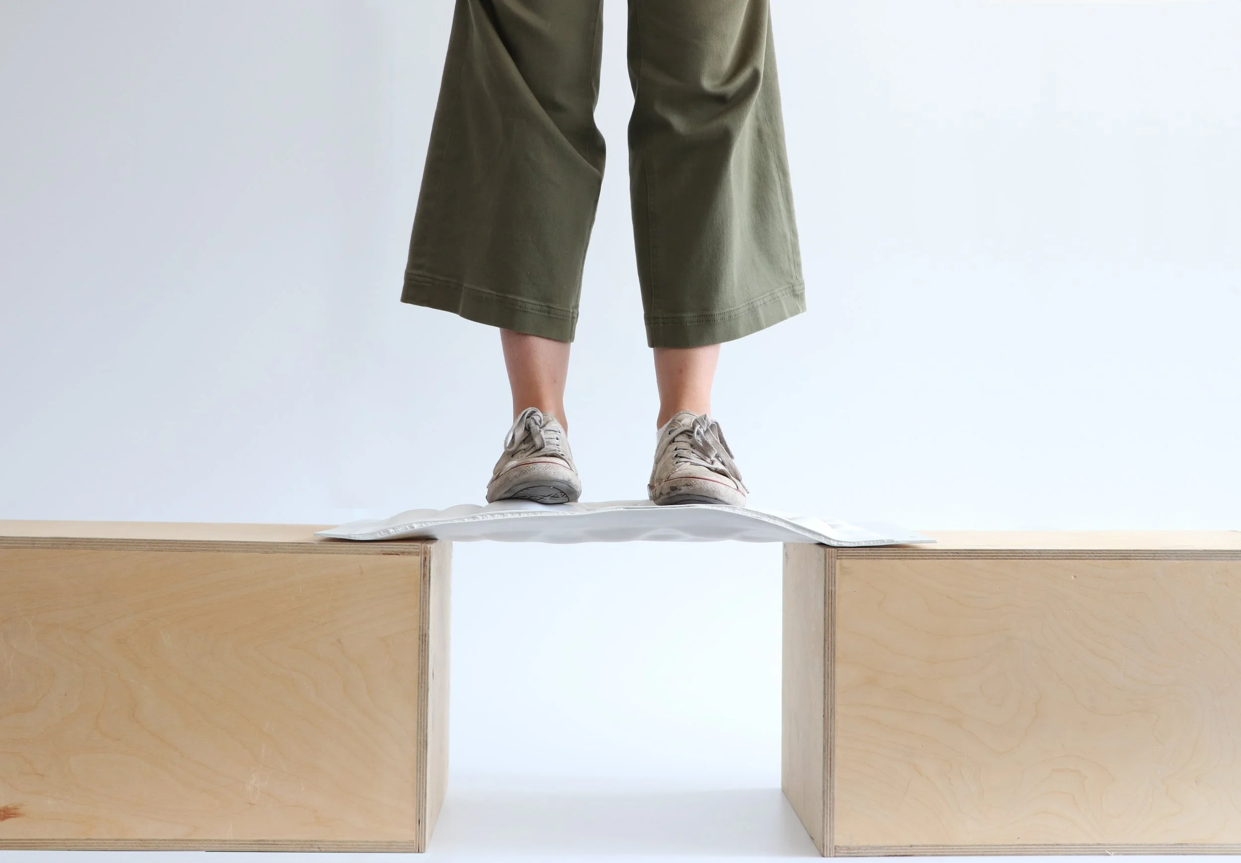 Fig 1: Two sheets of very flexible 2mm thick styrene sheets are fused together using a mix of the same plastic dissolved with acetone. Once dry, the assembly is heated and inflated. The result is a structural sandwich capable of supporting an adult.